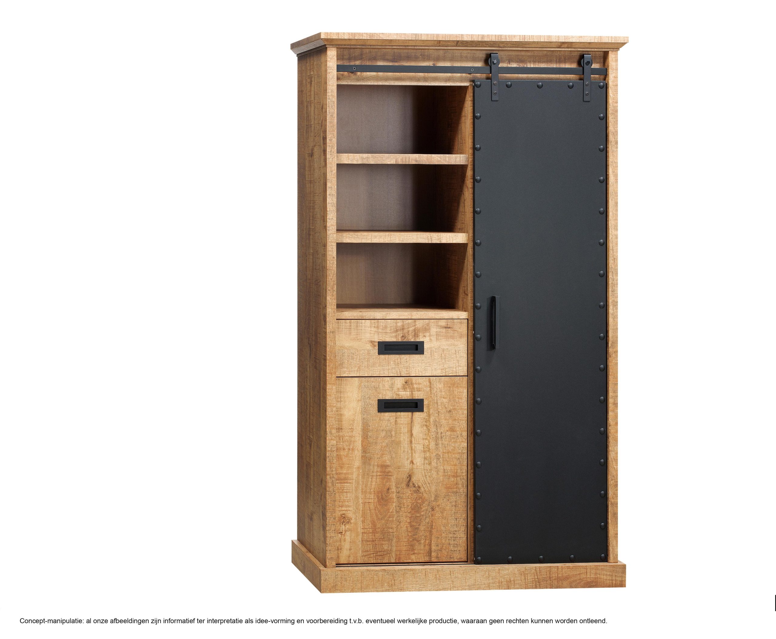 Formaat: 185cmx 107x 50m (h x b x d) 1 schuifdeur, 1 lade en 3 openvakken