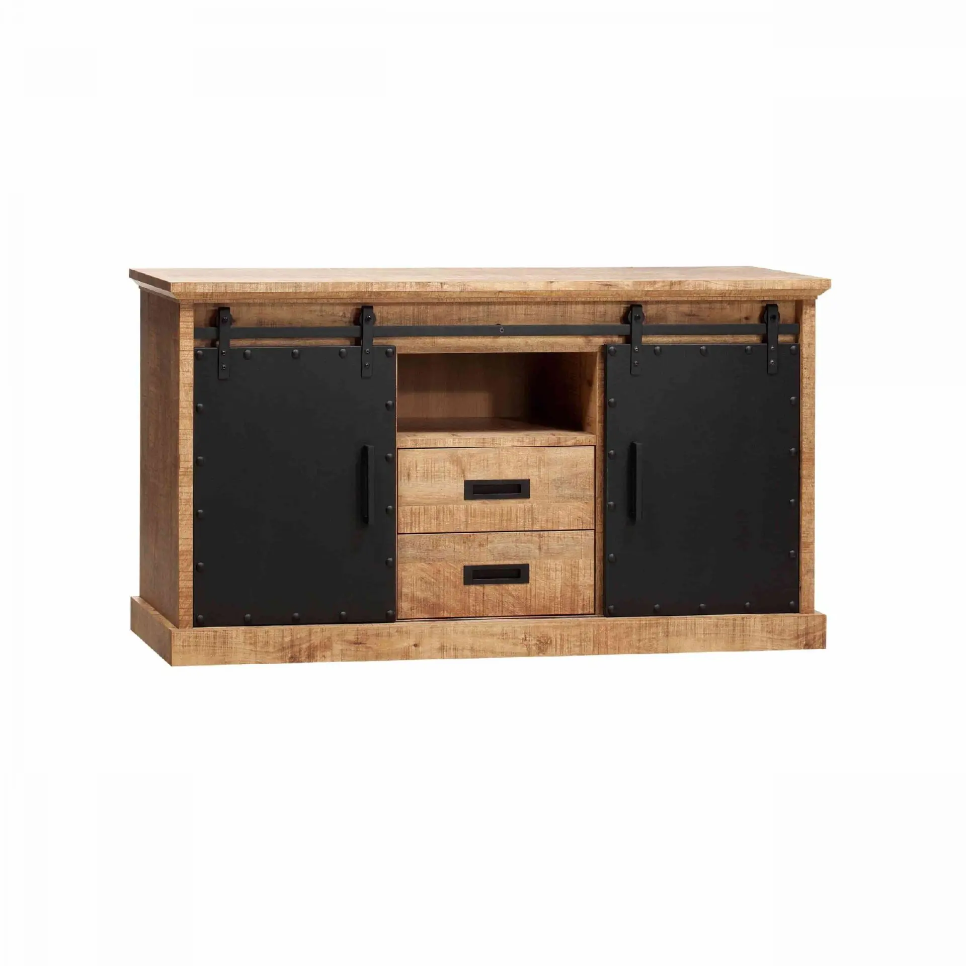 Het dressoir Steel 160cm klein is een stoer, industrieel meubel met een mangohouten uitstraling en zwarte metalen accenten, waardoor het in vrijwel elk interieur past.